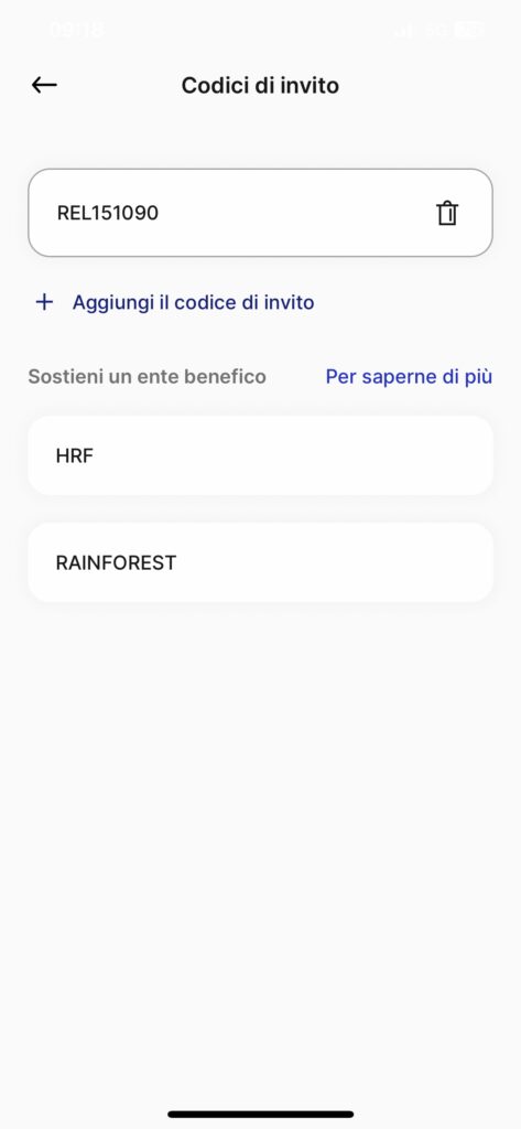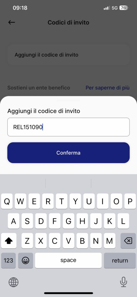 Copia e incolla il codice di invito Relai: „REL151090“.
